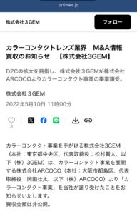 カラーコンタクトレンズ業界 M&A情報 買収のお知らせ